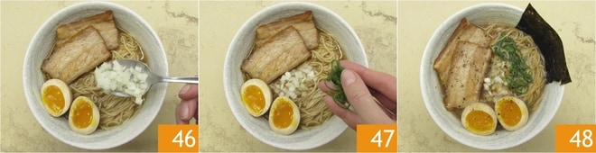 Completa con un poco de cebolla 46 y cebollino picados 47, un trozo de alga nori y una pizca de pimienta. ¡Tu ramen está listo para ser servido 48!