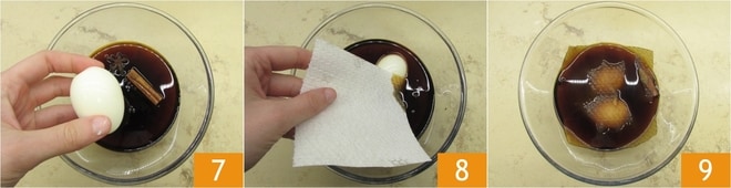 Pela los huevos y sumérgelos en la marinada 7, luego cubre con un papel de cocina (sin dibujos) 8 y deja marinar al menos 12 horas en el frigorífico.