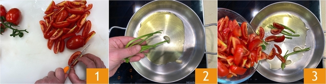 Para preparar el rape con aceitunas, primero lava los tomatitos y córtalos en gajos 1. En una sartén deja que se aromatice el aceite con el diente de ajo y los tallos de perejil 2, luego añade los tomatitos 3.