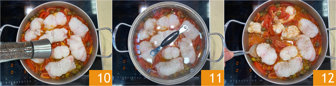Ajusta nuevamente de sal y pimienta 10 y cocina con la tapa durante 4 minutos a fuego moderado 11, luego gira los trozos al otro lado 12.
