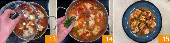 Cubre con la tapa y continúa la cocción durante otros 4 minutos 13. Por último, aromatiza con el perejil picado 14. ¡Tu rape con aceitunas está listo para servir 15!