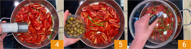 Sala 4, pimienta y cocina a fuego medio durante 5 minutos. En este punto, añade las aceitunas taggiasca 5, cubre con la tapa 6 y cocina a fuego lento durante unos 20 minutos.