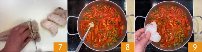 Mientras tanto, ocúpate del pescado: toma el trozo de rape y lávalo bajo el agua corriente, luego quita la piel y córtalo en trozos de aproximadamente 3-4 cm de grosor, manteniendo la espina central 7. Después de los 20 minutos de cocción, elimina el ajo 8 y coloca los trozos de rape en la sartén 9.