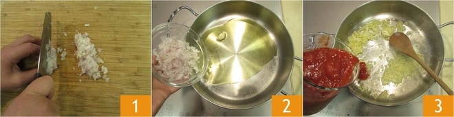 Para realizar el rape en guiso, primero comienza a preparar la salsa. Limpia y pica el chalote 1. En una cacerola añade el chalote picado finamente, el aceite y el ajo 2. Sofríe el chalote a fuego bajo durante unos 5-6 minutos. Añade el puré de tomate 3