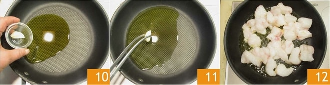 En otra sartén, añade un chorrito de aceite y el ajo, calienta a fuego suave para aromatizar 10. Quita el ajo 11 y coloca los bocaditos de rape 12.