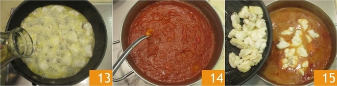 Desglasa con el vino blanco 13 y deja evaporar. Mientras tanto, quita el diente de ajo de la salsa 14 y añade el pescado 15.