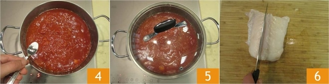 sazona, añade una pizca de bicarbonato para quitar la acidez del tomate 4. Baja el fuego y deja cocinar durante 25-30 minutos con la tapa puesta 5. Pasados 20 minutos, corta el rape en el centro 6
