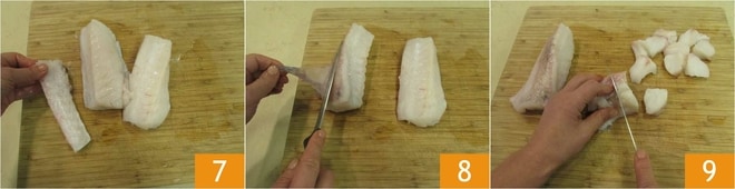 y quita la espina central 7. Retira los restos de piel 8 y córtalo en trozos del mismo tamaño, de unos dos centímetros 9.
