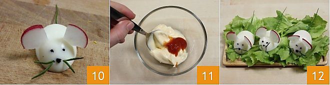 Tomad agujas de romero e insertadlas a los lados de la nariz formando así los bigotes del ratón 10. Vuestro ratón está listo, repetid el mismo procedimiento para los huevos restantes. Terminado los ratones, no os queda más que preparar la salsa rosa mezclando la mayonesa con el kétchup hasta obtener una salsa lisa y uniforme 11. Colocad ahora los ratones sobre un lecho de ensalada y servid acompañándolos con la salsa rosa 12.
