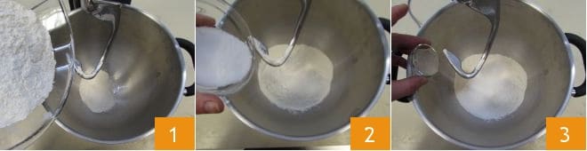 Para preparar las ravazzate sicilianas, empezad con la masa. Tamizad la harina y vertedla en una batidora con gancho 1. Añadid el azúcar 2 y la levadura de cerveza deshidratada 3.