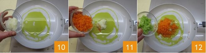 Mientras tanto, pasad a la preparación del ragú comenzando con el Cómo hacer el sofrito. Picad finamente la cebolla, las zanahorias y el apio. Luego, tomad una sartén antiadherente para hacer el sofrito de vuestro ragú y verted el picado de cebolla 10, zanahorias 11 y apio 12. Mezclad con una espátula o con una cuchara de madera los ingredientes para uniformarlos y permitir una cocción uniforme.