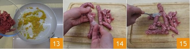 En este punto, añadid al sofrito también la carne picada 13. Luego, tomad una tabla de cortar y quitad la tripa que envuelve la salchicha 14. Luego aplastad ligeramente la salchicha con un tenedor 15 y recogedla en un bol pequeño.