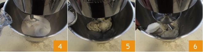 Empezad a amasar a baja velocidad y mientras amasáis, añadid el agua a temperatura ambiente en un hilo 4 y cuando el agua se haya absorbido, agregad también la sal 5. Luego, añadid la manteca, un trozo a la vez, asegurándoos de añadir otro trozo solo cuando el anterior se haya absorbido completamente 6.