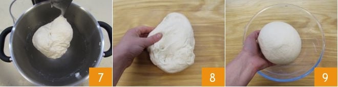 Cuando la masa se haya adherido al gancho y se despegue de los bordes de la batidora 7, transferidla a una superficie de trabajo 8. Trabajadla con las manos para darle una forma esférica a la masa y transferidla a un bol 9. Dejadla reposar durante unas 4 horas a una temperatura de 28-30°C, cubierta con un paño limpio o en un horno apagado con la luz encendida.