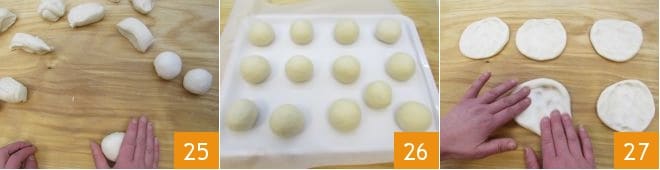 Recortad del tronco de la masa 13 piezas de 65 g cada una y formad bolas con las manos 25. Luego, tomad una bandeja y, después de forrarla con papel de horno, colocad las bolas 26. Dejad reposar durante aproximadamente 1 hora a una temperatura de 28-30°C. Cuando las bolas hayan reposado, aplastadlas ligeramente presionando con los dedos 27 formando una especie de pequeño disco.