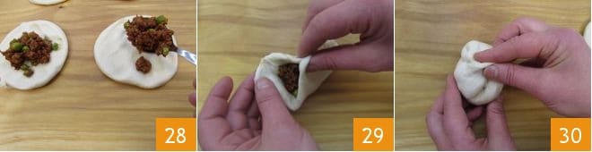 Ahora, id a llenar vuestras ravazzate. Con una cuchara, colocad en el centro del disco el ragú ya frío 28 y cerradlo uniendo los bordes y presionando ligeramente con las yemas de los dedos 29. Luego, cerrad también los otros bordes hasta formar una especie de bolsita 30.