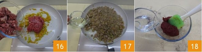 Añadid ahora también la salchicha al sofrito 16 y dejad cocinar a fuego medio durante unos 5 minutos asegurándoos de mezclar con una espátula para permitir una cocción uniforme. Luego, rociad con el vino blanco 17 y dejad evaporar. Ahora, en un bol aparte, disolved con un poco de agua el concentrado de tomate 18.