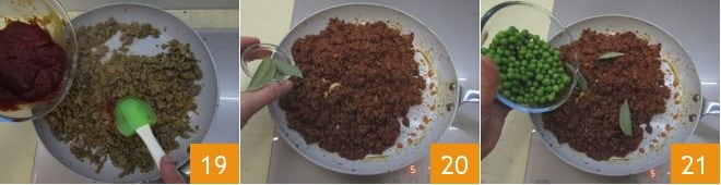 Después, añadid el concentrado de tomate en la sartén 19 continuando a mezclar bien con una espátula para amalgamar los ingredientes. Ajustad al gusto de sal y pimienta. Luego añadid las hojas de laurel 20 y dejad cocinar con la tapa durante unos 30 minutos a fuego lento. Luego, añadid también los guisantes 21 y continuad cocinando durante otros 10 minutos.