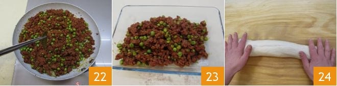 Una vez cocido el ragú, ayudándoos con unas pinzas de cocina, quitad las hojas de laurel 22 y transferid el ragú a un contenedor de vidrio para enfriar a temperatura ambiente 23. Cuando se haya enfriado, transferidlo al frigorífico (el ragú para rellenar las ravazzate debe estar frío). Transcurridas las 4 horas de reposo, retomad la masa y manipuladla en una superficie de trabajo para darle la forma de un tronco 24.