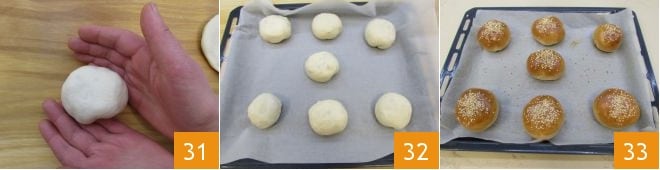 Cuando esté bien sellado, trabajadlo para darle una forma esférica 31. Repetid la operación hasta llenar todas las bolas de masa. Colocad las ravazzate bien separadas entre sí en una bandeja forrada con papel de horno, con la parte del cierre apoyada en el fondo 32. En un bol pequeño aparte, rompéd un huevo y pincelad las bolas de masa. Luego, decorad con las semillas de sésamo y hornead en un horno estático precalentado a 200°C durante 20 minutos (o en horno ventilado a 180°C durante 10 minutos). Sacad del horno 33, dejad templar ligeramente y disfrutad de vuestras ravazzate sicilianas!