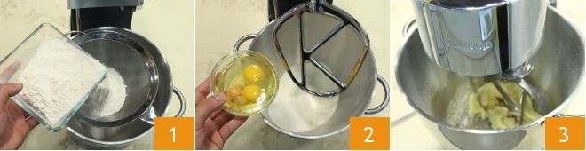 Para preparar los ravioles de patatas, comience preparando la pasta al huevo. Puede consultar el procedimiento de la Escuela de Cocina: pasta fresca al huevo. En el bol de una batidora, vierta la harina tamizándola 1 y los huevos 2. Monte la pala K y mezcle a una velocidad media-alta para crear una mezcla homogénea y suave 3.