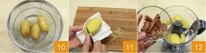 Cuando las patatas estén cocidas, escúrralas 10 y déjelas enfriar un poco. Luego, transfiéralas a una tabla de cortar para pelarlas, ayudándose con papel de cocina o un paño para no quemarse 11. Una vez peladas, córtelas en rodajas y colóquelas en la batidora. Luego, agregue una pizca de sal y la salchicha asada en trozos 12.