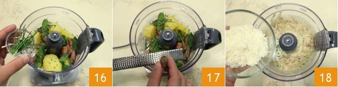 luego añada también el cebollino 16 y una ralladura de nuez moscada 17. Ponga en marcha las cuchillas de la batidora y cuando haya obtenido una crema homogénea, vierta también el Grana Padano rallado 18. Ponga en marcha la batidora hasta obtener una mezcla cremosa y homogénea.