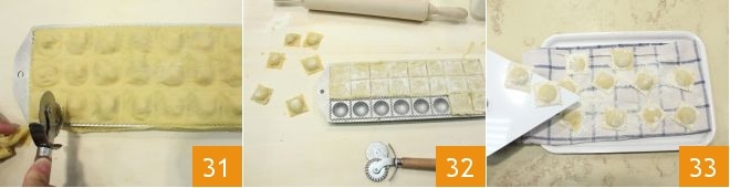 Luego, con un cortador de masa dentado, termine los bordes y cree los ravioles (31-32). Coloque los ravioles obtenidos en una bandeja forrada con un paño de cocina ligeramente enharinado 33.