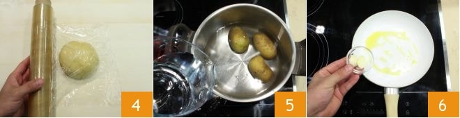 Luego transfiera la masa a una superficie o tabla de cortar y forme una bola. Envuélvala con film transparente 4 y colóquela en el refrigerador durante al menos una hora. Mientras tanto, prepare el relleno: ponga a hervir las patatas en una olla grande 5 durante unos 15-20 minutos o hasta que estén cocidas. Para facilitar la cocción, también puede cortar las patatas por la mitad. Mientras se cocinan, pele dos dientes de ajo y colóquelos en una sartén con aceite 6.