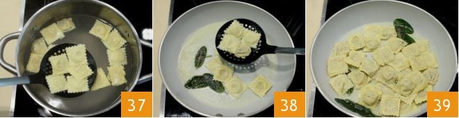Llene una olla con agua, sal a gusto y lleve a ebullición. Mientras el agua se calienta, en una sartén grande, vierta la mantequilla 34 y derrítala a fuego muy bajo. Luego agregue las hojas de salvia 35. Deje que la salvia se marchite por un momento. Mientras tanto, cuando el agua hierva, coloque los ravioles para cocinar 36: bastarán 1-2 minutos de cocción (estarán cocidos cuando comiencen a flotar en la superficie).
