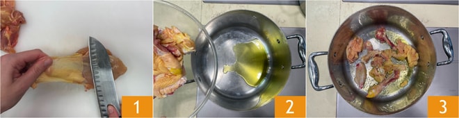 Para preparar los ravioles de pollo, comenzad con el caldo: eliminad la piel 1 y también los huesos del pollo, reservando la carne. En una olla grande verted un poco de aceite y a fuego muy alto dorad los huesos 2 durante unos minutos 3.