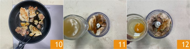 Coced bien por ambos lados durante unos 10 minutos 10. Cuando el pollo esté cocido, ponedlo en una batidora y añadid 90 g del caldo preparado anteriormente 11, sal, pimienta, mejorana y el huevo 12.