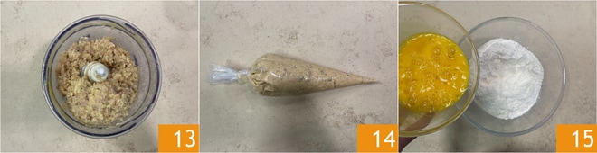 Batid el compuesto 13, luego transferidlo a una manga pastelera 14 y guardadlo en el frigorífico. Mientras tanto, preparad la pasta fresca: en un bol verted la harina y los huevos batidos 15.