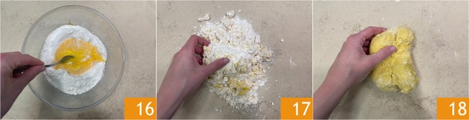 Recoged los ingredientes con el tenedor y luego continuad amasando a mano 17 hasta obtener un bollo 18, trabajadlo hasta que esté liso, tomará unos 15 minutos. Cubrid con film y dejad reposar la masa en un lugar fresco y seco.