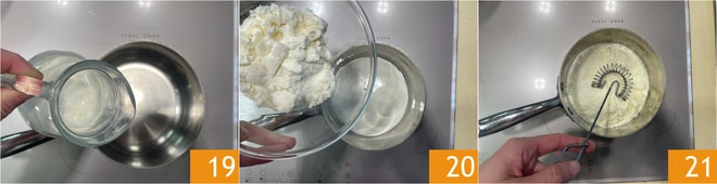 Realizad la salsa de pecorino: verted la nata en un cazo pequeño 19, añadid el pecorino rallado 20, dejad que se derrita a fuego muy bajo durante unos minutos, mezclando con unas varillas 21.