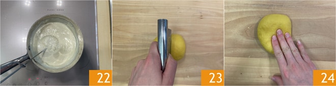 Debéis obtener una crema lisa y sin grumos 22. Formad los ravioles: dividid el bollo con un cortador y trabajad una pieza a la vez 23. Aplastadla para hacerla más fina 24.