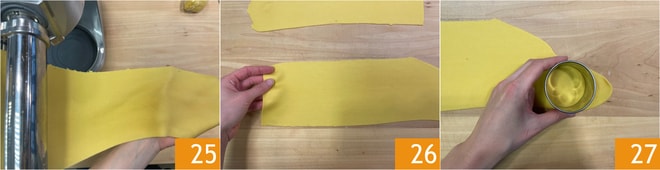Pasad el bollo por la máquina para pasta 25 hasta alcanzar un grosor de unos 3 mm 26. Cortad discos con un cortapastas de 5 cm 27.