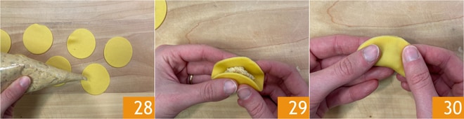 Rellenad el centro del raviol con el relleno a base de pollo 28. Doblad por la mitad 29, presionad bien los bordes para cerrarlos en forma de media luna 30.
