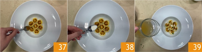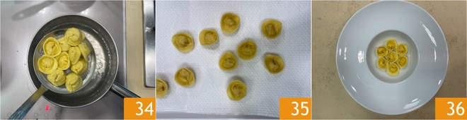 Escurrid los ravioles 34 sobre una bandeja con papel absorbente 35 y emplatad disponiéndolos de manera circular en el plato 36.