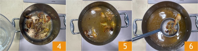 Cuando estén oscuros y dorados 4, desglasad vertiendo los 4 litros de agua fría y dejad cocer a fuego muy bajo durante 2 horas 5. Eliminad los huesos y colad el caldo 6.