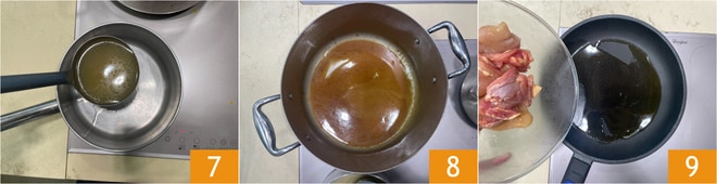 Reservad unos cucharones en un cazo pequeño 7, el resto volved a ponerlo en la olla y a fuego alto dejad que se reduzca hasta que se convierta en una salsita densa y oscura 8, aquí está listo el fondo de pollo. En una sartén antiadherente dorad la carne de pollo con un poco de aceite 9.