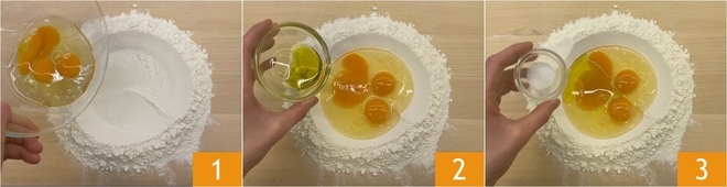 Para preparar los ravioles de ricotta y hierbas con salsa de nueces, comenzad con la masa de la pasta fresca: verted la harina sobre una superficie de trabajo, formad una fuente y añadid en el centro los huevos 1, el aceite 2 y la sal 3.