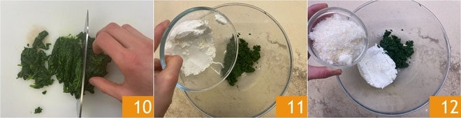 Mientras tanto, preparad el relleno: limpiad las hierbas mixtas y escaldadlas durante 3-4 minutos en agua hirviendo con sal 7. Escurrid las hierbas en agua con hielo 8, luego estrujadlas bien para eliminar el exceso de agua 9.