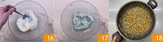 Mezclad bien 16 para obtener una mezcla homogénea 17. Si resulta demasiado blanda, podéis añadir un poco más de queso rallado. Pasad el relleno a una manga pastelera sin boquilla y reservad. Pasad a la salsa de nueces: tostáis las nueces en una sartén antiadherente durante 2-3 minutos 18, luego dejad enfriar.