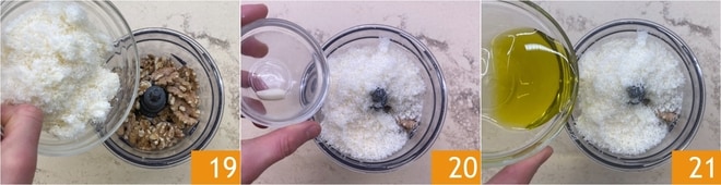 Trasladad las nueces a un procesador de alimentos, asegurándoos de reservar algunas para emplatar, luego añadid el parmesano rallado 19, medio diente de ajo 20 y el aceite 21.