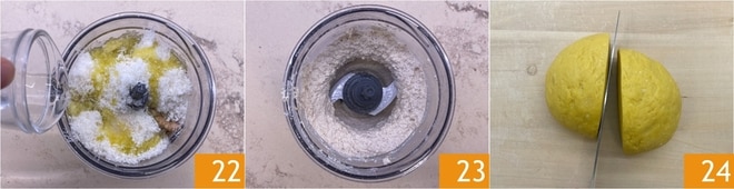 Sal, pimienta y añadid un chorrito de agua 22. Batid hasta obtener una consistencia cremosa y homogénea 23, luego reservad. Ahora, retirad la masa del frigorífico y divididla por la mitad con una rasqueta 24.