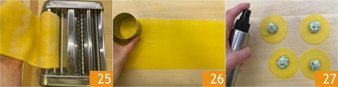 Aplanad y enharinad ligeramente la primera porción de masa, luego estiradla con la ayuda de una máquina laminadora, comenzando con el grosor más grande 25; debéis llegar a un grosor de 2 mm. Proceded de la misma manera con la segunda porción de masa, luego cortad discos con un cortapastas de 7,5 cm de diámetro 26. Podéis volver a amasar los restos y estirarlos nuevamente después de dejar reposar la masa. Exprimid una porción de relleno en el centro de cada disco, luego humedeced los bordes con agua 27.