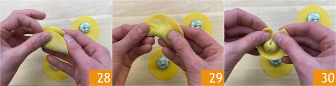 Dobláis el disco en media luna 28 y presionad bien los bordes asegurándoos de sacar todo el aire 29, luego unid los extremos 30 y pellizcadlos juntos.
