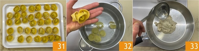 Colocad los ravioles uno a uno en una bandeja espolvoreada con harina 31. Estáis listos para la cocción: llevad a ebullición una olla con agua con sal y coced los ravioles durante 3-5 minutos 32. Mientras tanto, verted la salsa de nueces en una sartén y añadid un cucharón del agua de cocción 33.