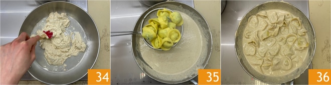 Mezclad bien para obtener un condimento cremoso 34, luego escurrid aquí los ravioles 35 y mezclad todo fuera del fuego 36.